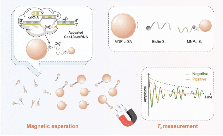 MNPs可作为MRS传感检测中的磁性探针。传统的基于MNPs聚集/分散状态改变的MRS生物传感方法易受样品基质干扰,稳定性较差。基于MNPs数量变化的MRS生物传感器已经得到了较好的发展。但是以上方法需要目标物自身提供位点以控制大小粒径MNPs之间的结合。目标物的表面位点有限且可能发生非特异性结合,因而检测灵敏度会受到影响。为此,本文将CRISPR-Cas12a系统与MRS传感技术相结合,利用CRISPR-Cas12a系统精准控制两种不同粒径MNPs之间的结合,开发基于CRISPR-Cas12a的MRS生物传感器检测沙门氏菌。