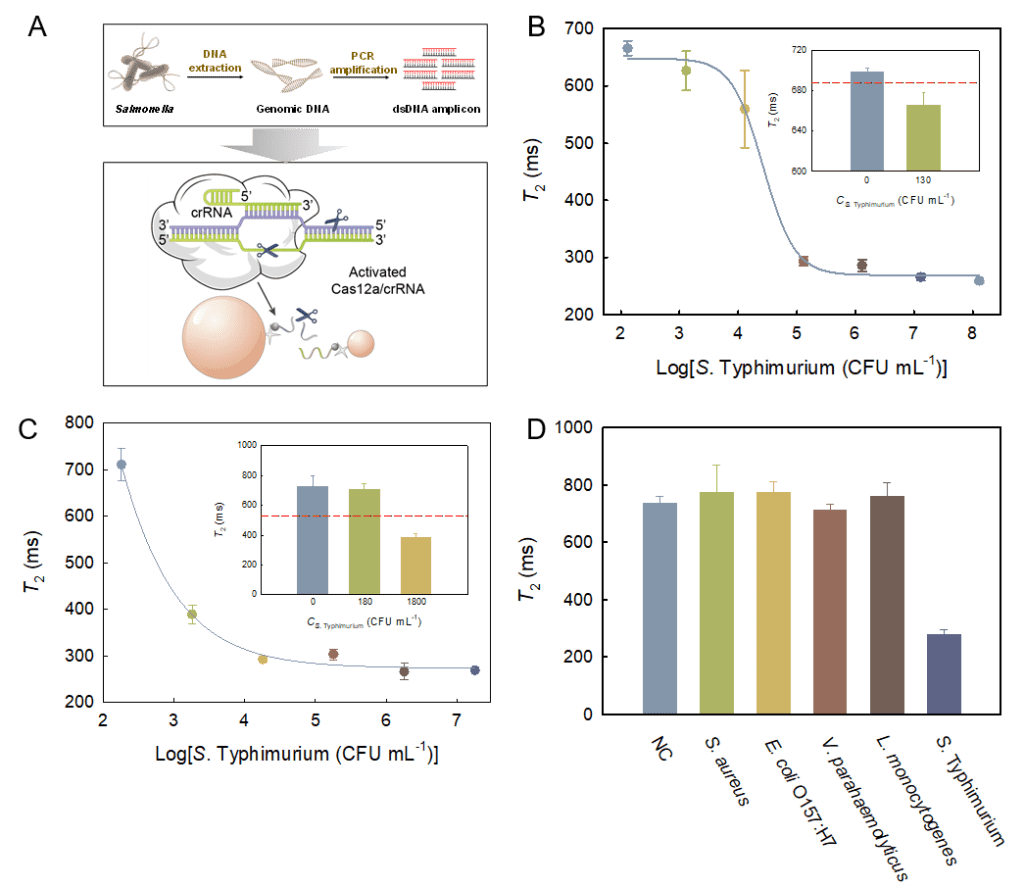 本文将CRISPR-Cas12a系统与MRS传感相结合,构建基于CRISPR-Cas12a系统的MRS生物传感器检测沙门氏菌。充分利用MNPs作为磁分离工具和信号标签的双重功能,为生物传感器的设计提供了新思路。同时,得益于CRISPR-Cas12a系统的高特异性和MRS检测的高灵敏度,该生物传感器对沙门氏菌具有良好的检测性能。