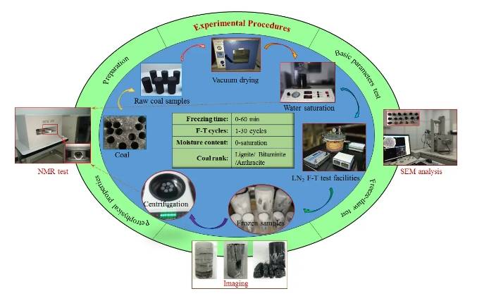 利用低场核磁共振技术,开展关于液氮冻结时间,冻融循环,煤体含水率和煤变质程度对冻融煤体物性改造规律的探索试验。4种冻融变量对冻融煤体的孔隙结构、孔隙度和渗透率均具有不同的改造规律。其中冻融循环次数对煤体物性的改造尤为明显。液氮对不同煤阶煤体物性的改造规律受煤体初始孔隙度影响,一般情况下,改造效果为:褐煤>无烟煤>烟煤。以期获得冻融变量对煤体孔隙结构和渗透率等物性参数的影响规律,为煤储层的液氮循环压裂技术提供数据支持。低场核磁共振技术在地质与矿业领域具有极大的应用前景和推广价值,有望成为地矿领域的常规化和标准化设备。