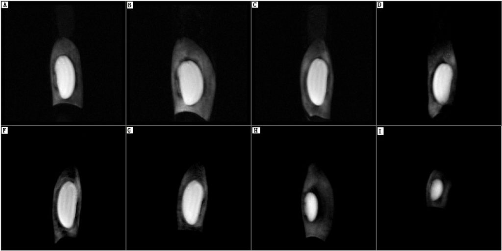 T1加权像在氢质子密度像的基础上,增加 T1 的影响效果。由于豆荚内油的T1小于水,且T1加权像中,T1 越短对应信号强度越强,亮度越高,所以 T1 加权像可以突出油信号。对应于下方图像,在豆荚和种子的种皮区域含油率极低,含水率高,在图像中表现为弱信号(由于含有水分子,依然贡献氢质子,所以在图像中依然有表现)。种子内部亮度不均匀,在质子密度分布均匀的情况下,亮度越高,说明此部分 T1 值越短,含油率越高。通过 T1 加权像能够初步观察油的空间分布情况。