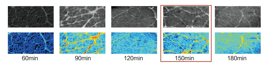 T1加权像中,网状纹理是牛肉中脂肪,较暗的部分为牛肉中肌肉组织,随着卤制时间延长,脂肪溶解,网状纹理变亮,随后脂肪溶出,水分进入,图像整体变亮,网状纹理消失。