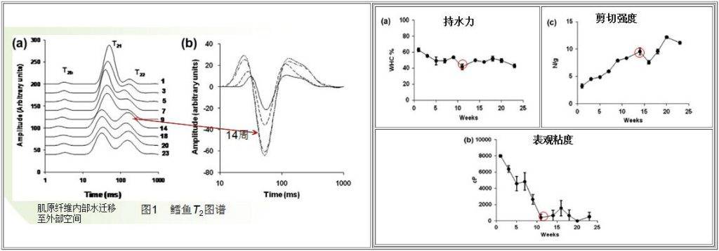 1.鳕鱼在-10℃贮藏过程,肌原纤维内部水分发生迁移,肌原纤维内部及间隙中的水分转移到外部空间,使得不易流动水含量逐渐降低,自由水含量逐渐增加,在贮藏10-14week时自由水含量达到最大,而此时持水力和表观粘度也同时达到最低,剪切力达到最大;