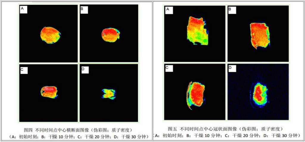 1.核磁共振成像中(图四和图五),颜色代表信号强度,红色信号越大,氢质子密度越大,蓝色信号越大,氢质子密度越小,通过核磁共振成像可明显看出不同干燥时段水分的分布及变化;